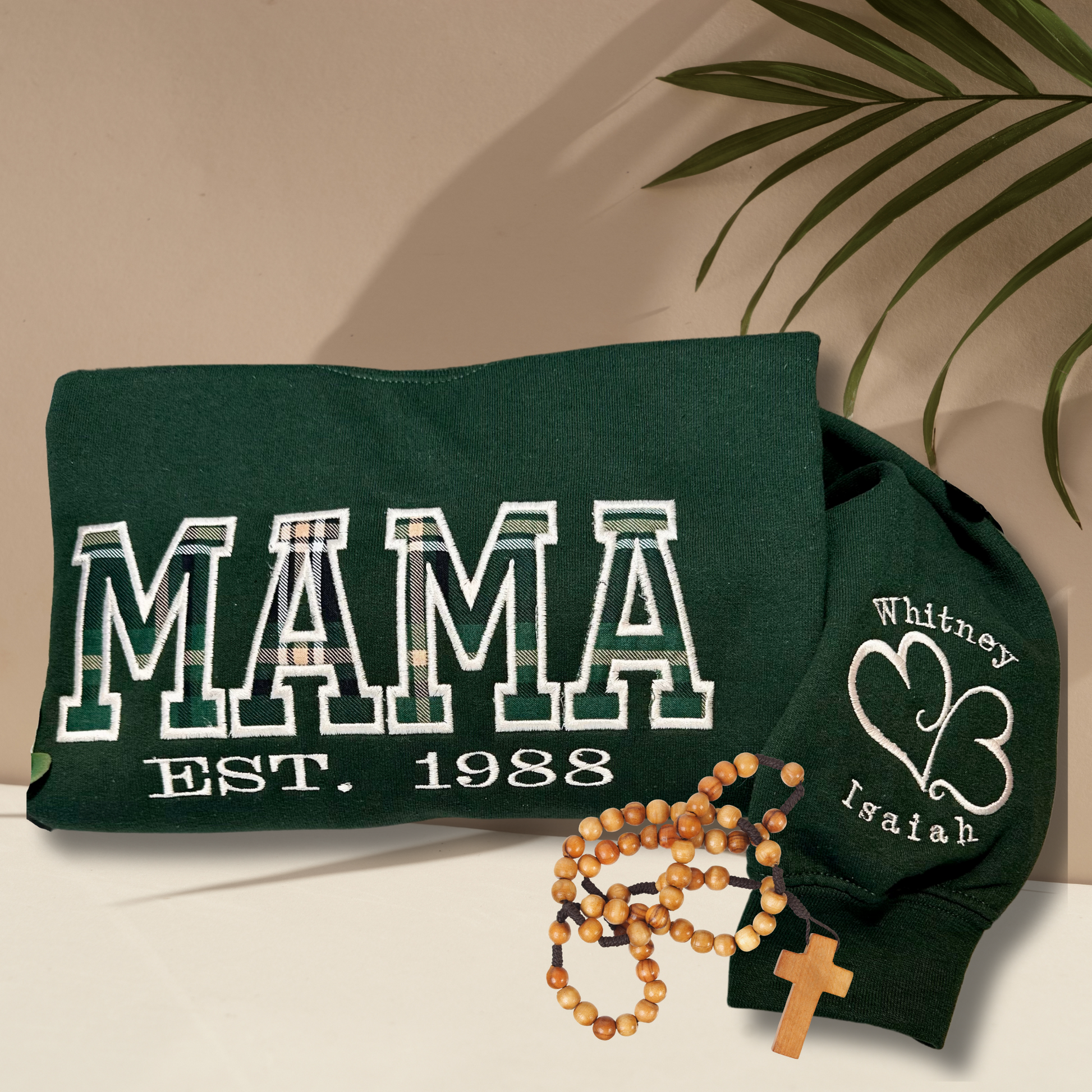 Gildan 18000 Unisex sweatshirts. Made with a medium-heavy fabric blend of 50% cotton and 50% polyester crew neckline. 100% ethically grown US. cotton. MAMA embroidered Applique & EST. with 2 names on sleeve. (3-4 names $62.50)
